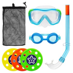 For little swimmers eager to explore the underwater world, the Combo Dive Set gives them all the tools they need for a day of water fun. All materials are latex and BPA free! Your child will enjoy their own set of swim goggles with deluxe silicone straps, adjustable nose bridge for comfort and comfortable PVC eye gaskets. When they're ready to switch gears and enjoy their first snorkeling experience, the mask is equipped with an impact-resistant lens that features UV protection. The PVC skirting is integrated to the frame and is designed for a comfort seal. The PVC split strap fits securely on the head and is easy to adjust. The snorkel features a PVC mouthpiece with integrated bite tabs. A snorkel keeper is included to easily attach to the mask and keep both snorkel and mask together while swimming about. Three weather-proof dive disks are included and slotted for quick sinking...create your own game play. When the day is done, gather up your swim and dive gear and store in the included mesh bag with drawstring closure and hang tab! All-in-one fun!