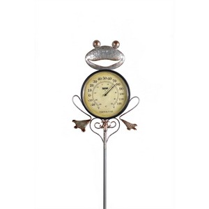 Adorn your backyard garden space with rustic elegance. This all-weather iron character is detailed with rust-color sponging that gives this whimsical character its rustic charm. The thermometer face measures 6.25" in diameter and can withstand extreme temperatures. Easy to assemble with male/female threaded end pieces and two-prong stake for pushing right into the ground. Use fully assembled for a taller profile, or assemble using top and bottom pieces only for use in more compact areas like planters. You can even use the character piece alone and hang as added wall or fence decor.