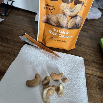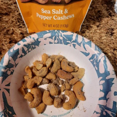 [This review was collected as part of a promotion.] I love cashews. So I was excited to try some in the sea salt and pepper flavor. The quality of the cashews themselves is good. They are all whole ones and larger halves/pieces. But unfortunately I wasn't a fan of the flavor. They used way too much salt in my opinion. They are just too salty. It overpowers the pepper flavor while you're eating them. You get the pepper more as an aftertaste when your mouth starts to burn after you eat them. While you're chewing them the salt is the main taste. My other disappointment came with the quantity. Yes, I saw the bag contains 4 ounces of nuts before I bought them. But there is SO MUCH salt & pepper in the bag. I'm guessing at least an ounce of the 4 ounces of product in the bag is seasoning. These were just very disappointing. I had high hopes for them and they just weren't what I hoped for. I will not be purchasing in this flavor again. I received an incentive to write this review.