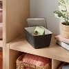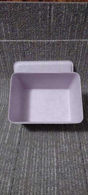 This stackable felt bin will be perfect for many uses. It is 8 1/4 inches long, 6 1/4 inches wide, and 41/8 inches tall. The lid settles flat and even around the edge. It is a gray color with a bluish gray interior. The tag states that is is made with about 20% recycled polyester and can be wiped clean with a dry cloth. These are perfect for holding vitamins, or bars of soap, sewing supplies, any number of things. It fits perfectly on my wicker bathroom shelf.