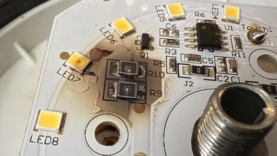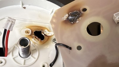 Touch button stopped responding and lamp wouldn't turn off. Disassembly showed that it had caught fire internally.