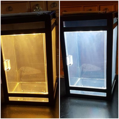 [This review was collected as part of a promotion.] I really like these lanterns. You can change the color to either white or amber, they’re easy to move, definitely hold a charge (from the sun!) for a long time and they have doors that open so you can put things in there for added decor. The one thing that I would change about them, or at least be careful when using, are the doors themselves. I accidentally broke a piece of door that helps it open. Not a big deal since it still opens and closes but be careful if you keep things inside and want to switch things out a lot.