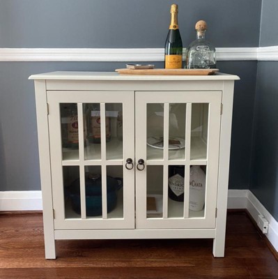 Versatile and stylish The Portland Cabinet is the ideal needed extra piece to complement your kitchen, dining or living area. Just the right cabinet to arrange your trinkets, books, linens, or even videos with one fixed and two compartments for spacious storage. Constructed with MDF and temperedglass doors in a black finish and loop metal pull handles, this cabinet adds a classic style to any room.