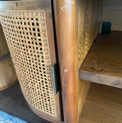 A: It features curved cabinet doors with cane inserts for added texture and visual interest.