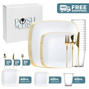 Posh Setting 280 Piece White And Gold Plastic Party Bundle - Classic Square (40 Settings)