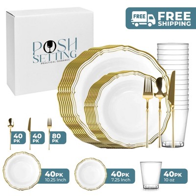 Posh Setting 280 Piece White And Gold Plastic Party Bundle - Contemporary (40 Settings)
