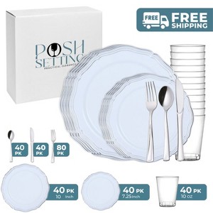 Posh Setting 280 Piece White And Silver Plastic Party Bundle - Aristocrat (40 Settings)