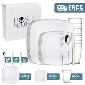 Posh Setting 280 Piece White And Silver Plastic Party Bundle - Classic Square (40 Settings)
