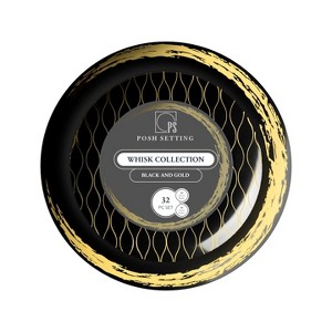 Posh Setting 32 Piece Combo Pack Black and Gold Round Plastic Dinnerware Set - 16 Settings - Whisk