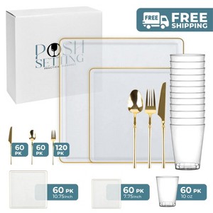 Product Name: Posh Setting 420 Piece Clear And Gold Plastic Party Bundle - Square Edge (60 Settings)