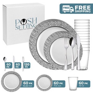 Product Name: Posh Setting 420 Piece White And Silver Plastic Party Bundle - Lace (60 Settings)