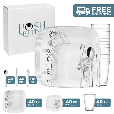 Posh Setting Elegant White and Silver Disposable Dinnerware Bundle offers the ultimate convenience for hosting upscale events. This all-inclusive set features dinner plates, salad/appetizer plates, 10oz clear hard plastic cups, spoons, knives, and double forks per setting, all in a refined White and Silver design. Ideal for weddings, parties, and upscale gatherings, ensuring easy cleanup.