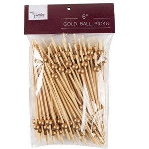 - Disposable serving picks with an extended 6-inch length, made from natural bamboo with a gold accent.