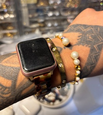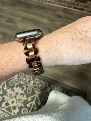 Transform your Apple Watch® into a true piece of jewelry with the Aria band. Crafted with a timeless blend of glossy tortoise resin and polished gold-plated stainless steel, this band strikes the perfect balance between classic and statement wear. Built for everyday wear with an easy-to-use clasp that keeps your Apple Watch® secure all day long.