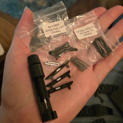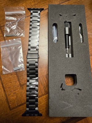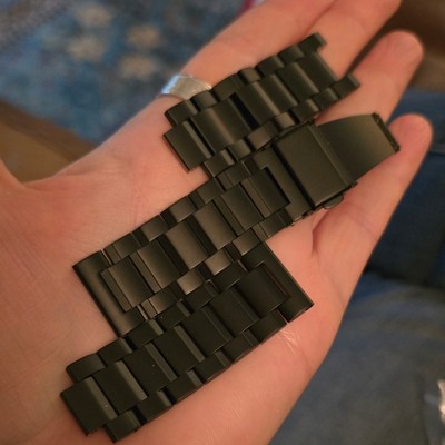 [This review was collected as part of a promotion.] When I first received this, I was amazed at the weight of the band. It feels so great in your hand and the matte black finish is super pretty. The band comes with a ton of parts for a whole bunch of different cell phones so they pretty much have you covered there. And the tool you can see in one of my photos is so that you can have it push the pins out from the band links. I always wondered how they did that. The only downside is that in the process of removing a couple of links to make it smaller for my wrist, one of the pins flew out, never to be seen again. So with the additional parts and tools they include, some extra ones of those would be helpful (this is referring to the pin that attaches the links to the clasp, not the link pins). - Received as a gift for an honest review.