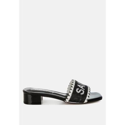 Add some glitz to your look with our ""Saint Tropez"" beaded heels. These low-block heeled sandals with an open square toe are perfect for adding some jazz to your day or night outfit. The plush cushion insoles offer a comfortable experience whenever you slip into these microfiber beauties. Type: Heels Upper Material: Microfiber Outer Sole: TP Rubber Open Square Toe SAINT TROPEZ Patterned Bead Embellishment Contrasting Stitch Detail Low Block Heel Plush Cushion Insoles Slip-On Style Heel Height: 1.5 inches SH5600