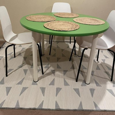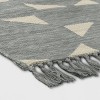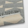 A: The rug features a geo tapestry pattern in neutral hues with fringes.