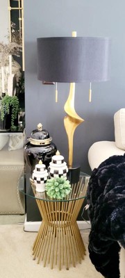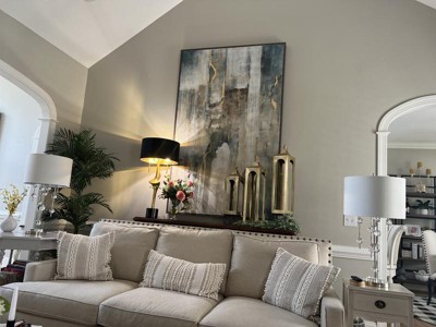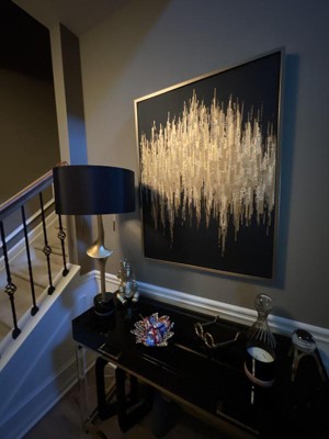 Such a statement piece! It sits on my foyer table and really is a work of art. An added feature is the gold underlay of the black shade that produces a warm, rich color when lit.