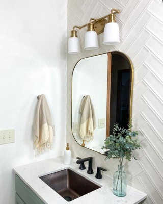 Rounded corners create a compellingly simple silhouette for this rectangular metal wall mirror. It features a slim stainless steel frame in brushed gold finish surrounding timeless beveled glass. Install vertically or horizontally over a console or in a hallway nook.