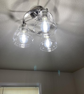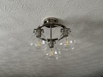 A classy contemporary design with an industrial touch. From the Possini Euro Design line of home lighting, this semi-flushmount ceiling light is sure to provide reliable illumination without sacrificing style. It features three gently curving glass shades with open bottoms, exposing the bulbs inside. A handsome brushed nickel finish covers the round canopy and accents the light.