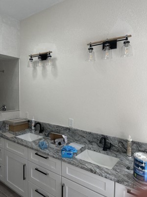 Needed to replace the light fixture in my bathroom that has an oak vanity. Wanted to s upgrade the look and feel of our bathroom without having to renovate the entire room. Started to add black accents in the room and this fixture had the natural wood color and black accent. This fixture upgraded the bathroom. It looks great! However, there are 2 things I want to point out that made me give this a 4-star rating - 1) the jars aren't clear - they have a seedy motif that is stated in the product details. I should have paid attention to that. Based on the pictures, I thought the jars were clear. It's not a deal-breaker and the seedy motif did give the fixture a bit more texture. 2) the biggest gripe I have on this fixture is that it was not aligned. when we hung the fixture to our wall, we leveled the back post (the black frame). But, the wooden bar is not completely aligned - it's a bit off/crooked. My leveler confirmed that so if you wanted the bar to be straight, you would have to set the back post slightly crooked. Or vice versa. It's not that noticeable but if you're big on attention to detail, you'll notice. For the price you're paying, you should expect perfection. Disappointed that there was a flaw with my fixture and I should get a discount for it. Aside from that, my bathroom looks great!