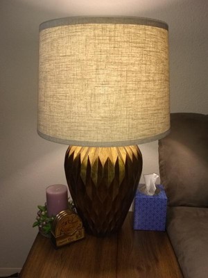 Wowwie! This lamp well exceeds my expectations and is more gorgeous in person than online! It looks like it is metal- has a very nice paint job on a resin-type, faceted base. It was a speedy delivery with no damages. I used a soft white LED bulb and the lamp is perfect for the location. I use it as an accent light in my living room and it compliments the decor perfectly. Looks like it costs twice as much! Highly recommend :))