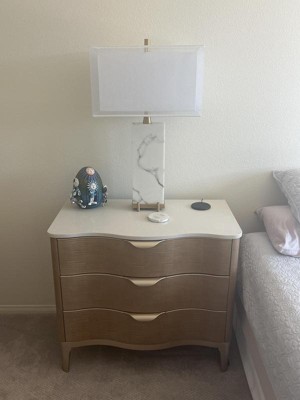 I had a heavy turquoise lamp before and this was just a breathe of fresh air in my living room. Light but looks like real marble and has just a touch of brass. The shade is what really makes it stand out.