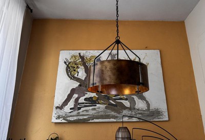 Beautiful addition to our kitchen. Its metal bronze shade with distressed markings make it feel like it was from the old industrial factory days. It casts a beautiful warm glow and really adds character to our home.