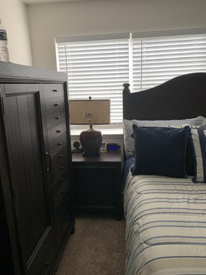 - Rectangular fabric shade with double trim along the top and bottom. Black finish pedestal base. 7 1/2-foot long clear cord and plug.