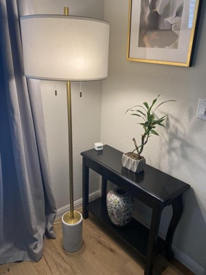 Beautiful floor lamp! The lamp shade is quality with a perfect color white ivory. The marble base is heavy which makes it sturdy. Definitely a classic lamp.