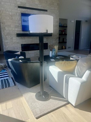 Love this lamp! So difficult to find a more modern floor lamp that does hand over the furniture. Need something heavier and sturdy so the dog didn't accidentally knock it over. Only two drawbacks?it was a little difficult to assemble and I wish it was a three way bulb.
