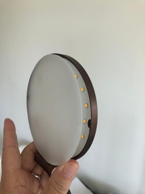 This lamp is not the quality I expected. It has a missing screw from the acrylic diffuser plate, it has a rough metal edge on the base and it has a curious flat copper-brown finish—not bronze toned. It is lightweight. It is contemporary in its profile, but not a contemporary design star.