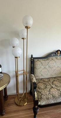 Possini Euro Candida Warm Gold 4-Light LED Floor Lamp is great! I was looking for a lamp to replace my halogen torchiere lamp which lights up my living room really well. Finding a replacement was a struggle until I found this one. Not being halogen, it lights up my living room just as well as my old halogen lamp, but the bulbs don't heat up like the halogen does-- which can be a fire hazard. The lamp itself is lovely and appears to be well made. Wish the cord, especially the dimmer cord was a bit longer (love that it is dimmable). Love the patterned glass globes, so pretty! I would give this lamp 5 stars, but want to live with it for awhile and see how it endures. Appreciate the excellent description on the website (e.g,, lumens, different heights for lights, etc.).