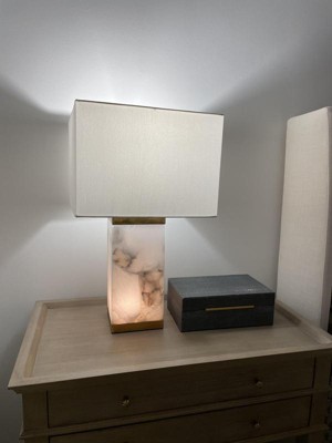 - Alabaster rectangular lamp base. Light brass finish metal bands and accents.