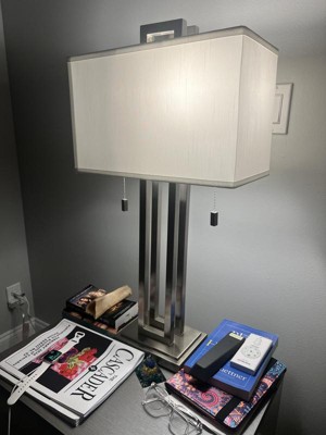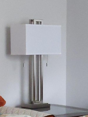 This is a sturdy well made and nicely designed lamp. It is a quality lamp with its pull chains, nickel finish and white fabric rectangular shade. It has a good weight to it and looks great!