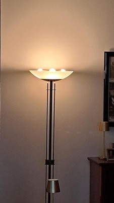 Love the design of the floor lamp. Absolutely terrible design of glass shade. All 4 light bulbs show above the glass shade. It looks goofy and there is terrible glare from the bulbs. They need to go back to the drawing board and reposition of the bulbs so they fit lower in the glass shade. Extremely disappointed.