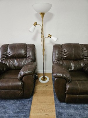 There is no doubt this is a beautiful floor lamp but be aware that the assembly process is somewhat difficult due to poor design and/or construction. 1-The marble base is very heavy making it difficult to maneuver while assembling. An extra pair of hands is helpful although not absolutely necessary. 2-The power cord is actually three separate cords that run through a small hole in the center of the marble base and makes an immediate 90° turn to exit the marble base on a small hole at the side. The small hole in the center barely has enough room for you to put your fingers in to grasp the cord to pull through to add or reduce slack. 3-The real problem is where the lamp post attaches to the marble base. The threaded post on which you screw the lamp post is only about an inch high, which is much too short to support a 6-ft tall column. This means the lamp post has a tendency to lean and not remain vertical. To compound matters, this threaded post on the marble base has threads that are too small and are not hardened enough. This makes it easy when screwing the post onto this base to get it misaligned -resulting in stripping these threads. This attachment post needs to be twice as large as it is with thicker threads that are much more hardened. 4-The two small reading bulbs on the sides of the lamp have a lock nut that screws down to the base to keep the shade in place. This lock nut is about an inch and a half in diameter but you cannot install it with your hand because the lamp shade interior is too narrow at the base. A tool is supplied which has a very long neck allowing you to hold the tool outside the shade, fit it over the locking nut, and tighten it to secure the shade to the main post. The problem is the tool doesn't properly fit the lock nut. At least mine didn't. 5-This lamp has a foot switch. I don't like foot switches, but it would be okay if it was one you tapped with the sole of your foot to turn the lamp on and off. But that's not how this switch is designed - it has a slide mechanism that you're supposed to slide back and forth with the sole of your foot. I hate it. Do you know how hard it is when you're over 70 years old to balance on one foot and use the other foot to very likely touch a piece of plastic and slide it back and forth? It's difficult. I gave this lamp a two-star rating. It is beautiful and it provides a lot of light - and a lot of floor lamps don't. But to be honest, I wish I hadn't bought it.