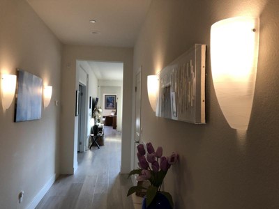 We purchased 4 Possini Euro Isola sconces that instantly elevated the look of the entryway.