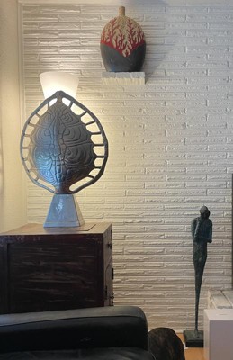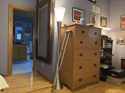 I love this lamp. Graceful curves offset the angular lines of the corner space. Dimmable light so you can adjust and make it right.
