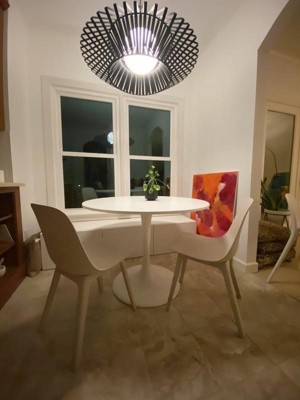 Beautiful light adds a modern touch to our dining room. Love to have it on even when we're not dining. It's on a dimmer switch so the ambiance is adjustable. Note that we've had to change out the bulb because it would flicker. Apparently that's common with an older dimmer switch but entirely fixable. Google it if that happens to you.