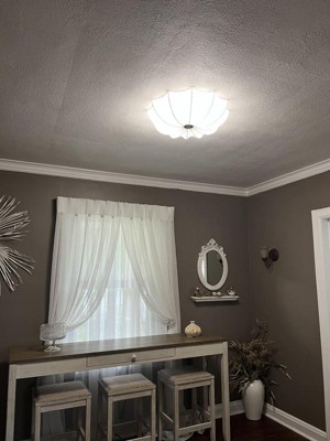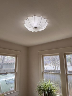 I bought two of these ceiling lamp fixtures and really like them (and everyone who’s seen them compliments them). But be aware that the color doesn’t look like the photo on the Web. When the light is off, the shade looks white (in the photo there’s a pale peach cast to the color) and when the light is on, the ribs supporting the fabric and the folds in the fabric look dark gray (the rest of the fabric looks white). The fixtures also look much larger than I envisioned and my bedrooms are very small with low ceilings. For that reason only I will likely replace them when I find replacements that I like as much as these.