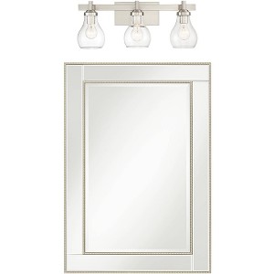 Our designers have selected the perfect pair of bath vanity light and wall mirror, just for you! Embrace a clean, classic look with a hint of romance and charm. This brushed nickel finish three-light bath light offers a seamless, airy elegance with a toned-down design. Beautifully contoured clear globe glass shades play up the minimalist look of a brushed nickel wall plate. From Possini Euro Design, this fabulous fixture also comes with the rectangular Trena champagne finish wall mirror from Noble Park