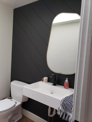 This mirror is beautiful and I love the unique shape. My floating vanity is fusion quartzite, so it works with the unique flow of the stone vanity. Unfortunately, it overpowers my small powder room. I wish the mirror came in a smaller version.