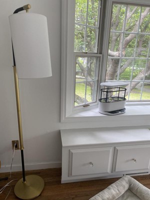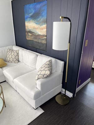 Beautiful lamp that adds accent and of course, as lamps are made to do, lots of light, through its clean modern shade. The base is super stable and the angle of the shade can be adjusted. The floor switch is very convenient.