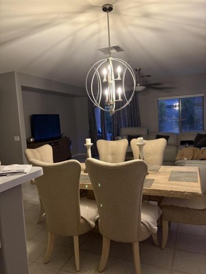24" Possini sphere chandelier! Absolutely stunning! Easy to assemble! Modern look I was looking for! See also my review on the 16" matching chandelier for kitchen nook.