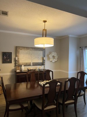 Love this pendant lamp. It has a sleek, warm look over our dining room table and fits in with traditional furniture.