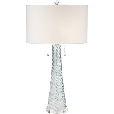 This sleek and contemporary table lamp is made from mercury glass and metal to match any home decor. By Possini Euro Design, the mercury glass detail in the base creates a lovely effect. It is paired with a layered drum lamp shade for added dimension and visual intrigue to complete the look. Each lamp includes Round Black Marble Riser.
