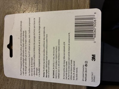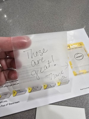 [This review was collected as part of a promotion.] 3M gave me a free sample of this product to evaluate. Because the sheets are transparent, it is a little hard to determine which side of the stack is the front...the back flap is clear plastic and when I first got them, tried writing on that side before I realized that was the back. I tried writing with a variety of pens to make sure they all worked. The only problem is when you remove a sheet and stick it on something, it is so transparent that it is hard to see the edges as it blends into the background, which might mean you try writing off the side of the sheet.