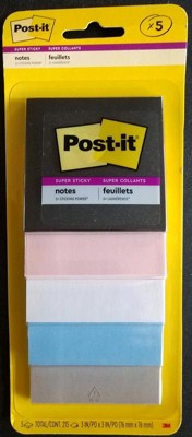 [This review was collected as part of a promotion.] The Post-It Super Sticky are the best with the best sticky adhesive that stays in place. Stays on multi-surfaces and stays up. I used on painted drywall, around a monitor frame, metal filing cabinet and they stayed in place and when removed left no sticky residue. Comes with 3"x3" 45 sheets of 5 colors for a total of 225 sheets. I loved the Simply Serene color pallet that the sheets come in they fit any home or office decor. The sheets are uncoated so you can use with any kind of pen or marker. The black sheets are great with gel pens and makes the writing really pop. In conclusion I would highly recommend the 3M Post-Its. The item description was just as described and I would buy it again.
