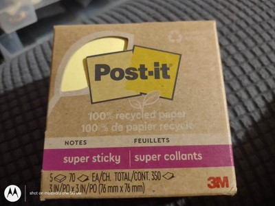 Post-it Notes Super Sticky 100% Recycled Paper Super Sticky Notes, 3" x 3", Canary Yellow, 70 Sheets/Pad, 5 Pads/Pack